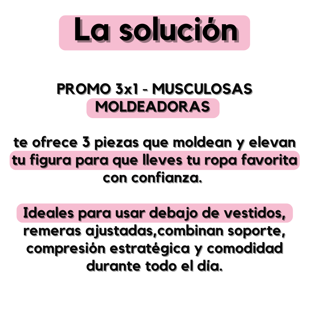 1. ¿Qué incluye exactamente la PROMO 3x1? Incluye 3 musculosas moldeadoras (pueden ser del mismo color o combinadas según stock) al precio promocional indicado. Perfecto para tener repuestos o combinar con distintos outfits.