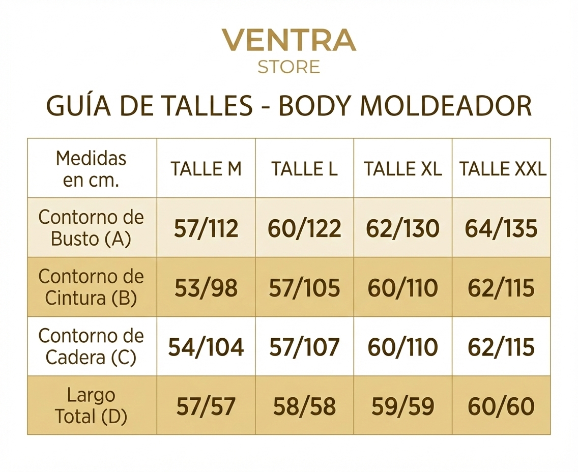 D) Largo total: Medir desde el comienzo del escote hasta la entrepierna - Tener en cuenta que los Breteles son regulables.