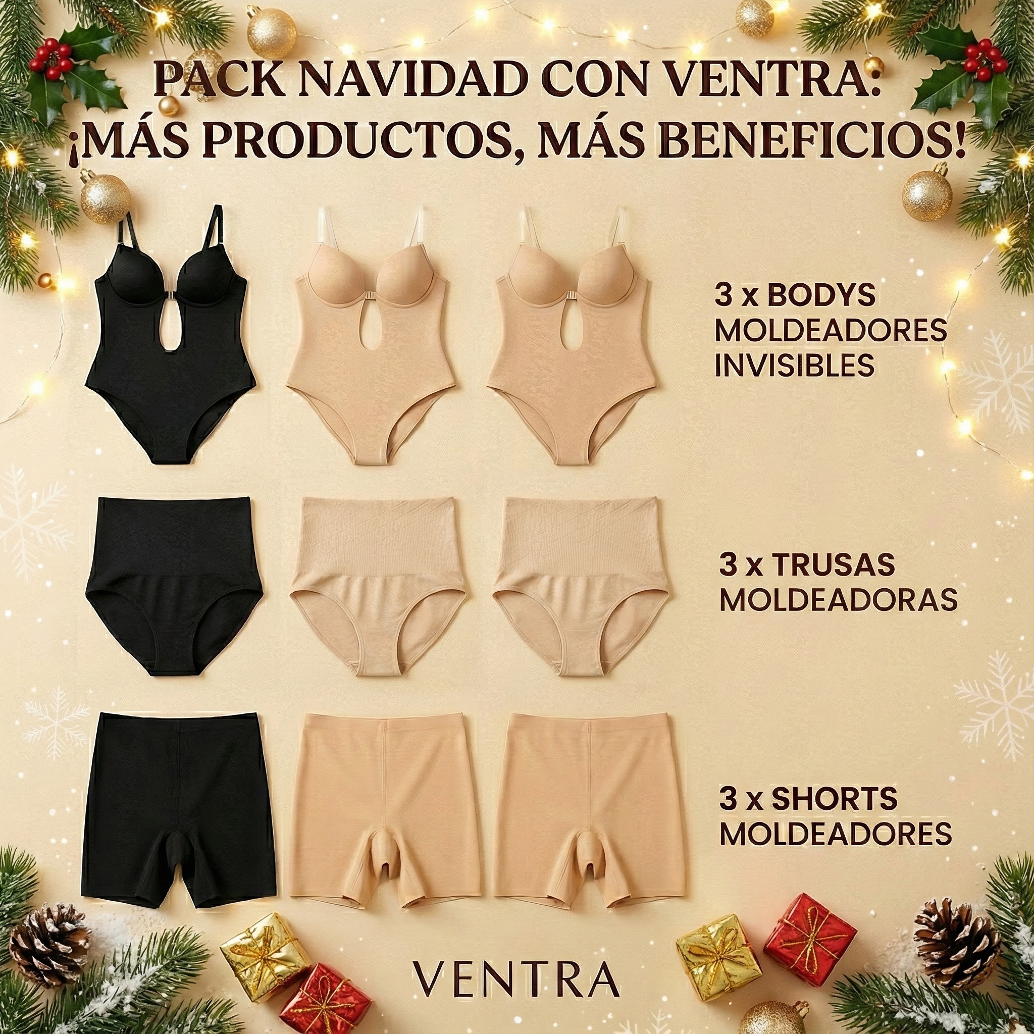 ¡El PACK NAVIDAD CON VENTRA es la solución definitiva para modelar tu figura de pies a cabeza! Llevate el armario completo de una sola vez: 3 Bodys Invisibles, 3 Shorts Moldeadores y 3 Trusas Control Abdomen. Lo mejor: su tecnología de segunda piel es TOTALMENTE INVISIBLE BAJO LA ROPA y su tejido respirable es ideal para disfrutar el verano sin transpirar.